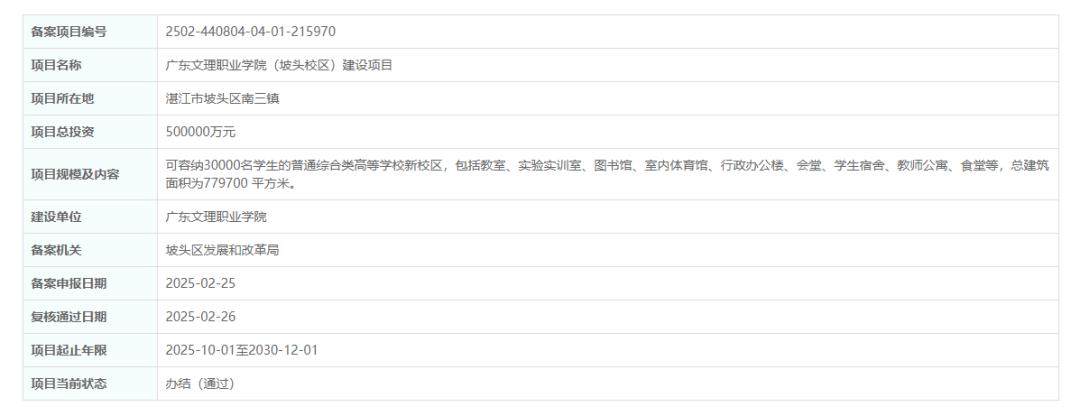 近日,广东省投资项目在线审批监管平台公示了一则消息:广东文理职业学院(坡头校区)建设项目正式通过坡头区发展和改革局备案,新校区将建在湛江市坡头区南三镇,项目总投资500000万元,拟建成可容纳30000名学生的普通综合类高等学校新校区,包括教室、实验实训室、图书馆、室内体育馆、行政办公楼、会堂、学生宿舍、教师公寓、食堂等,总建筑面积为779700平方米。