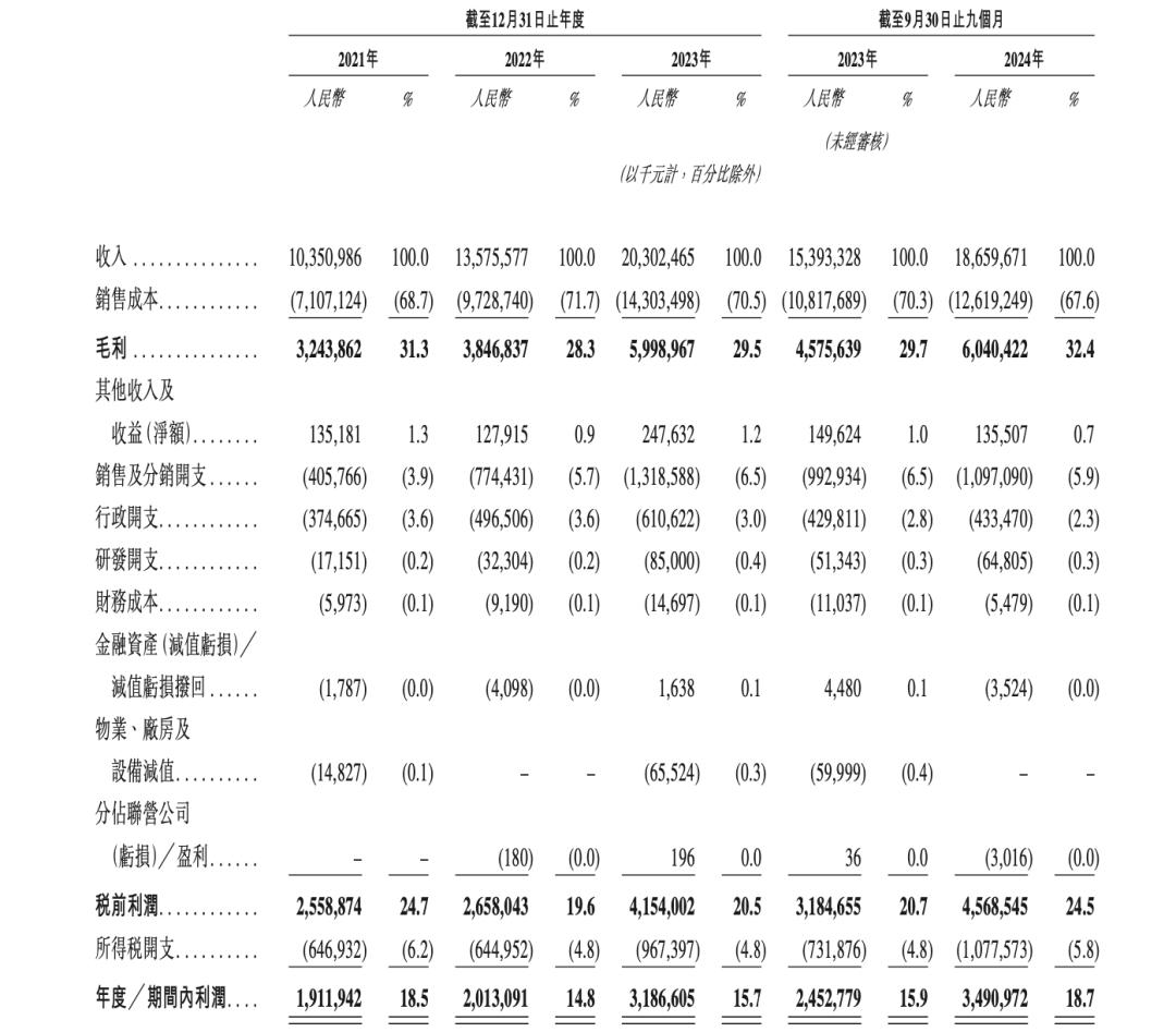 其中,“蜜雪冰城”所得收入及毛利分别占蜜雪冰城总收入及毛利的95%以上。于2021年、2022年、2023年以及2024年前三季度,“蜜雪冰城”的毛利率分别为31.4%、28.9%、30.3%及32.9%。