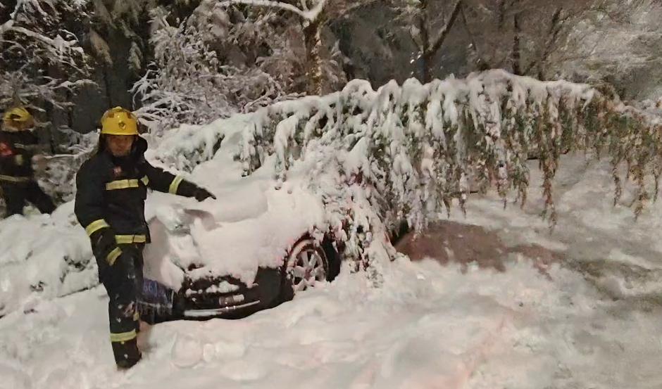 -滨州-3月2日19时16分,滨州邹平市,一辆私家车被积雪压断的树木砸到,急需救助。消防员赶到现场,立即使用工具进行处置,并对旁边其它有隐患的树枝也进行了清理。
