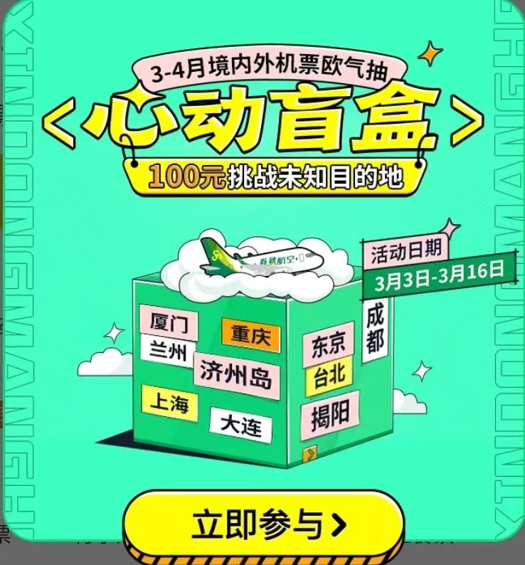 盲盒价格:100元(不含税费,基建燃油等税费需自理),航线覆盖春秋航空已通航的指定目的地城市。航班日期覆盖2025年3、4月。邀请2位好友助力,助力人可获得满99元减5元的机票优惠券。(活动详情请查看“春秋航空”小程序、APP)UGC玩法:旅客在小红书平台发布活动海报笔记,带上关键词 #春秋航空心动盲盒 #挑战未知目的地 @春秋航空,即可参与免费机票抽奖。抽奖奖品为免费单程机票(不含税费),适用航班日期为2025年3月6日至3月31日。