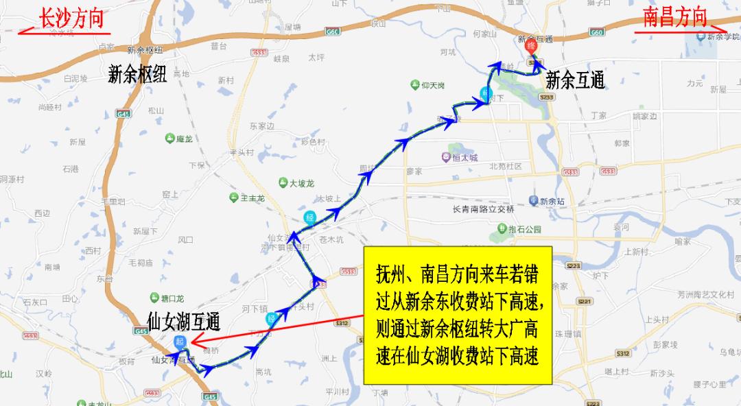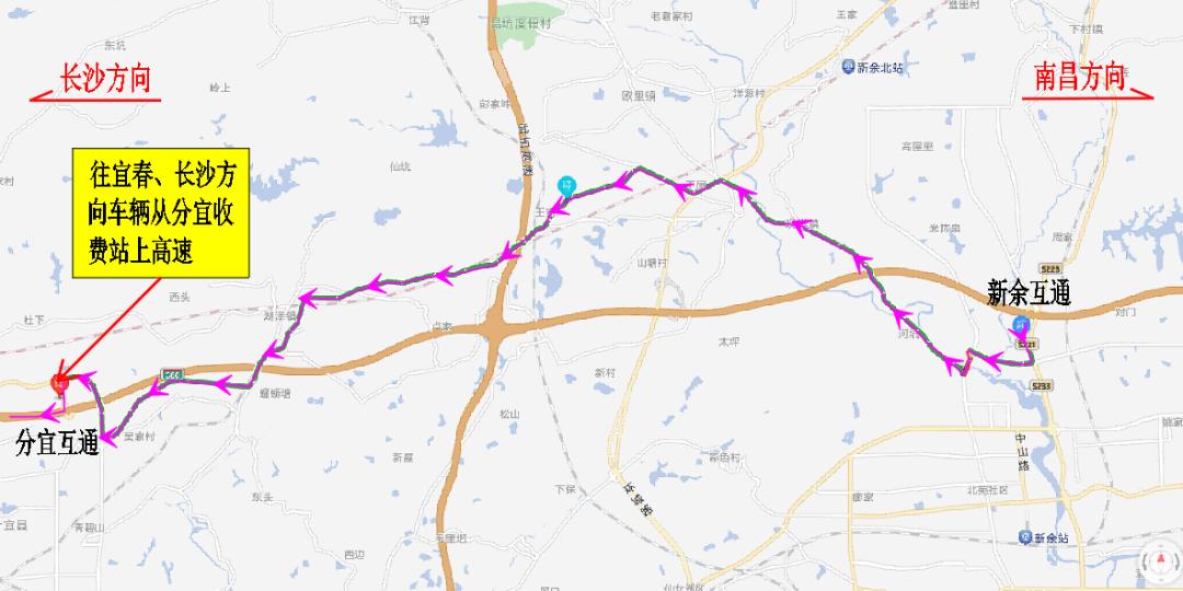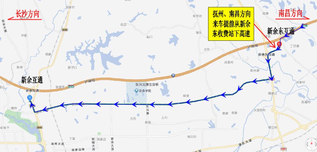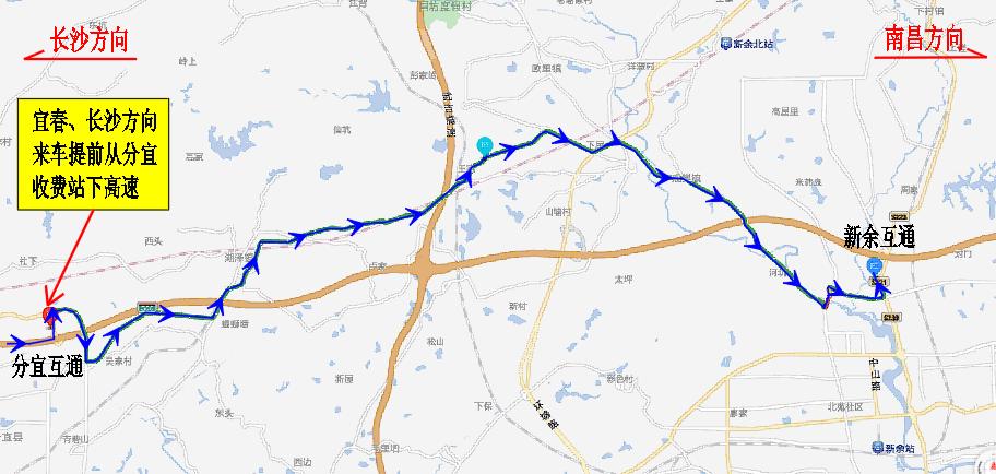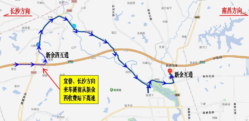 ②宜春、长沙方向来车下高速绕行线路:方案一:G60沪昆高速长沙方向车辆在分宜收费站提前下高速→222省道→渝钤大道→801县道→299县道→劳动北路→钟灵大道→阳光大道→新余收费站。