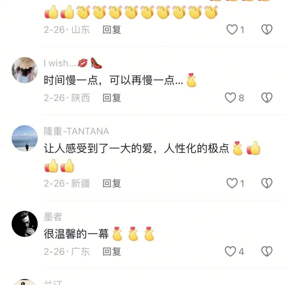 各地网友纷纷热议"慢火车"承载的温情:有人动情留言"车轮请慢些转动,别错过岁月长河里的人间烟火";“火车司机探头一瞬间,我哭了!”甚至有来自圣马力诺的网友说:“这里让我认识到一个温暖的中国。”......