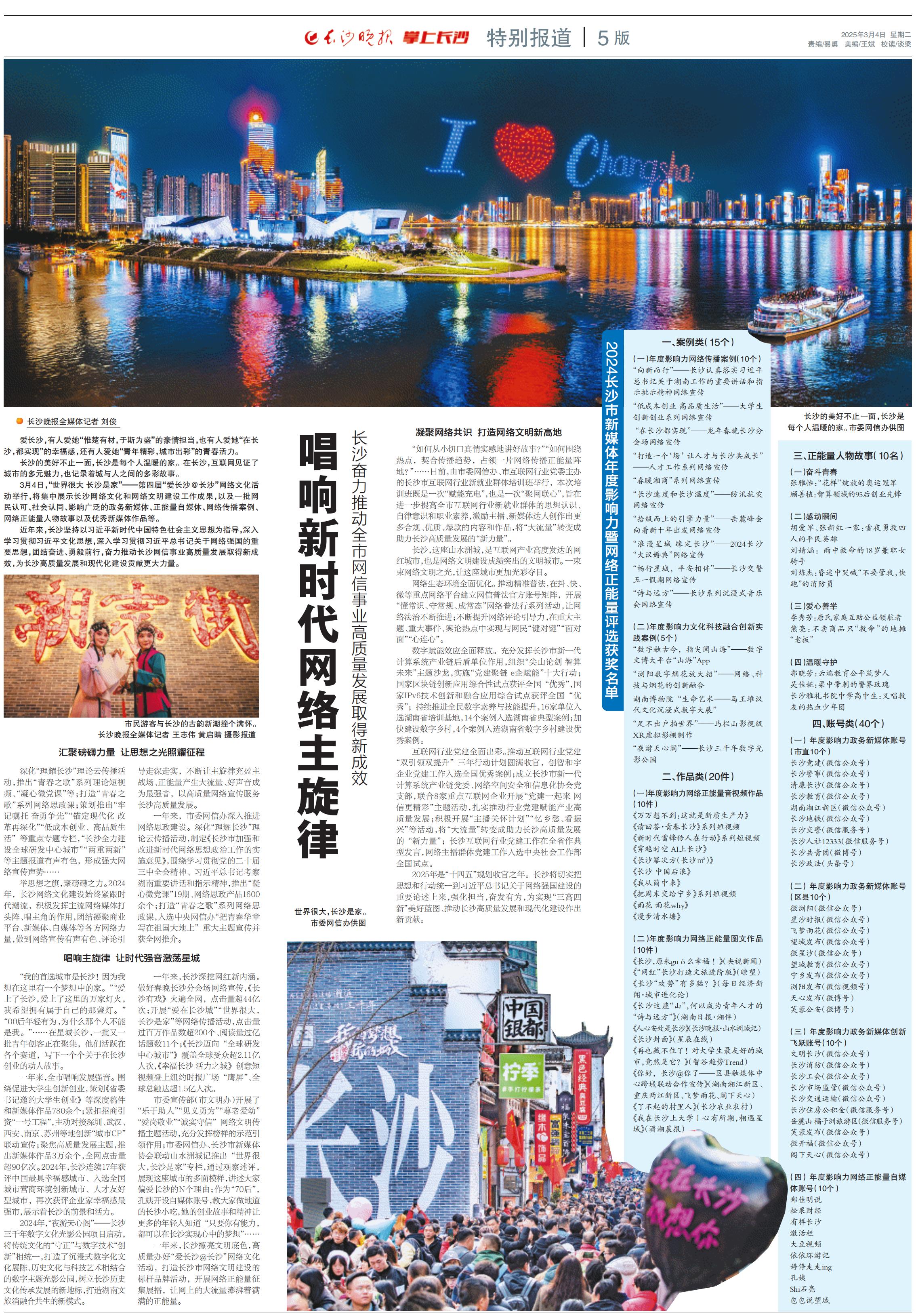 举思想之旗,聚磅礴之力。2024年,长沙网络文化建设始终紧跟时代潮流,积极发挥主流网络媒体打头阵、唱主角的作用,团结凝聚商业平台、新媒体、自媒体等各方网络力量,做到网络宣传有声有色、评论引导走深走实,不断让主旋律充盈主战场、正能量产生大流量、好声音成为最强音,以高质量网络宣传服务长沙高质量发展。