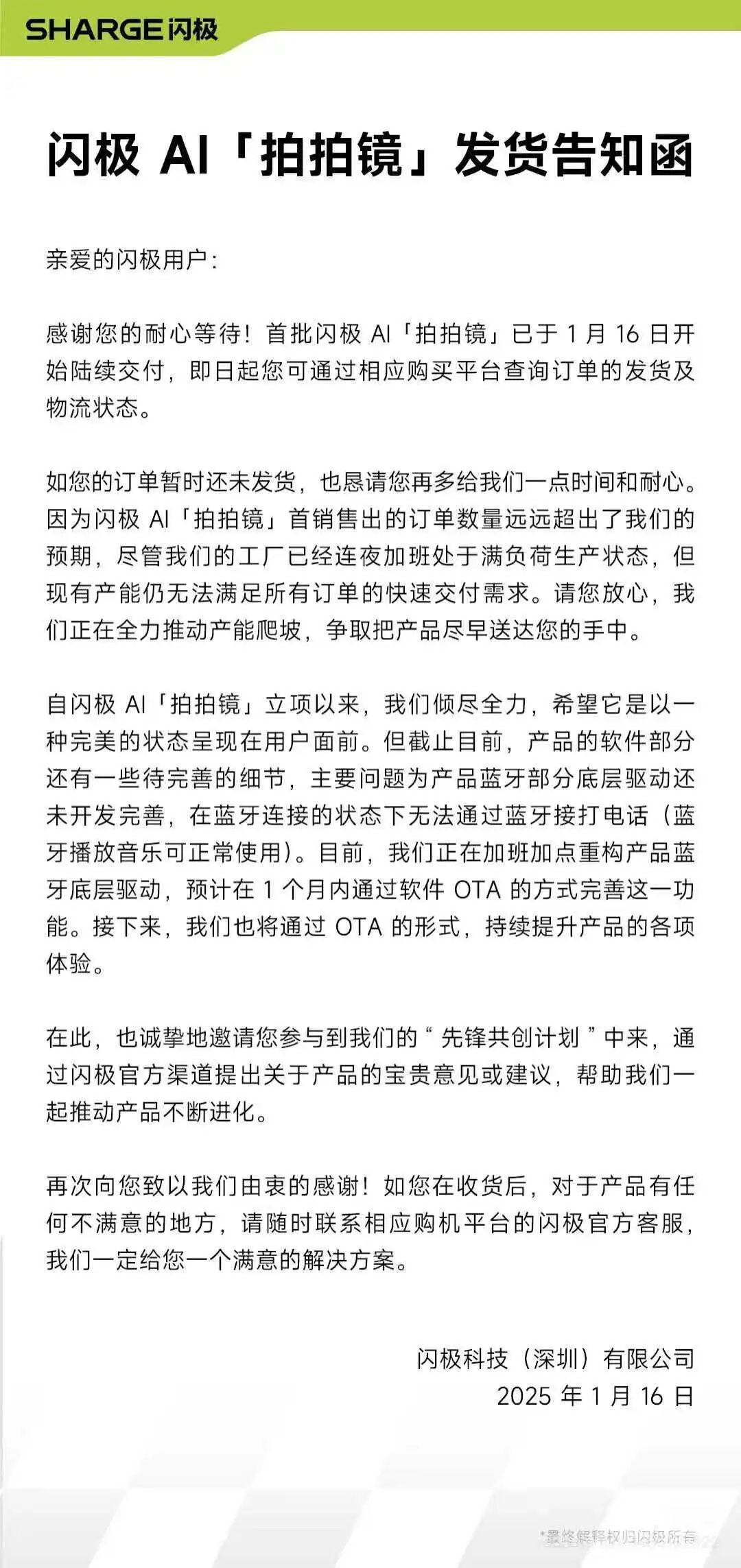 多位早期用户表示,自己等待了7个多月才最终收到商品;而不少12月底预定的用户也已等待了2个月的时间,至今还没看到物流单号。「电厂」就此询问闪极官方,得到的回复是:“产品已知的软件问题,团队目前正在加紧解决,很多还涉及到平台和元器件伙伴的协同,所以现在看还需要一段时间。 发货这块目前我们还是在按计划分批在放。”