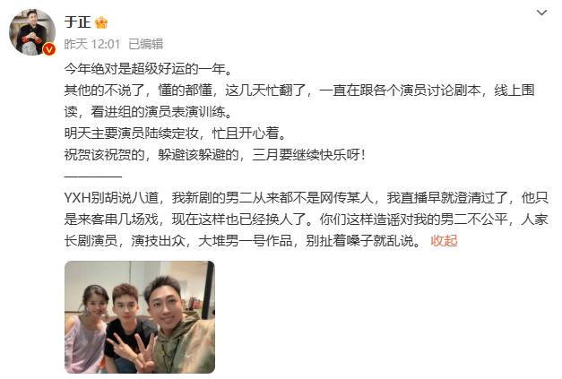 随后,于正发博澄清,他只是来客串几场戏,现在这样也已经换人了,并且他从来都不是新剧的男二。