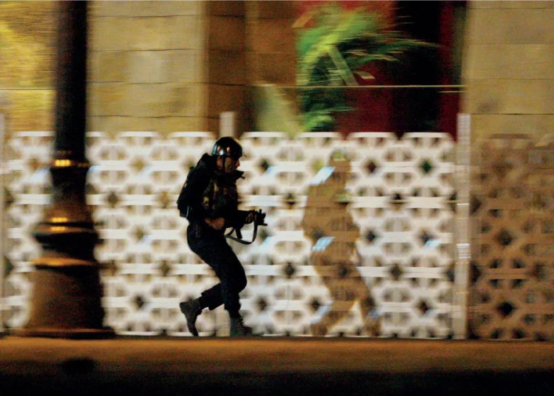 一名“黑猫”突击队员进入泰姬酒店。路透社0点12分,(国内治安)联合警务秘书致电国家安全卫队,也警告说调动只是可能的,没有开绿灯,但答应从空军参谋长那里弄一架飞机过来。3分钟后,准将戈文德·辛格·西索迪亚(DIGOps行动部副总督察)将特遣队转移到了帕拉姆简易机场。0点34分,内政部最高级别公务员、内政秘书马杜卡·古普塔来电说,马哈拉施特拉邦首席部长终于请求调动国家安全卫队。报告总结说,在克拉巴大堤的第一枪打响3个小时后,他们终于获准出发。