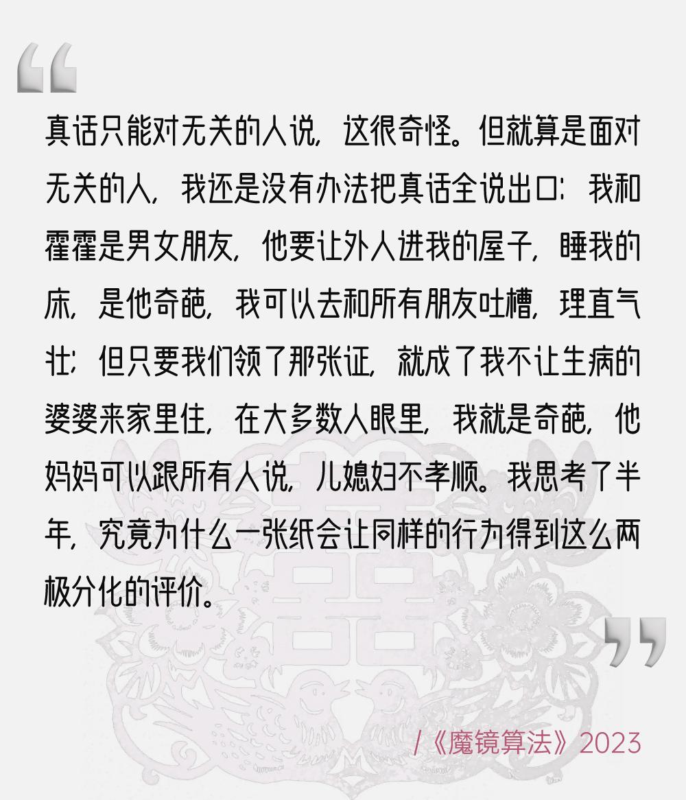 后来我意识到可能因为《2181》构建的是一个女性作为推动者的故事,《魔镜算法》会触及到更多女性面临的质疑和困境。它写的更多是我作为中年女性面临的困境,它讨论的议题很多,讨论单身的问题,讨论老龄化的问题,讨论了男女之间的关系,包括新技术发展对我们生活的改变。