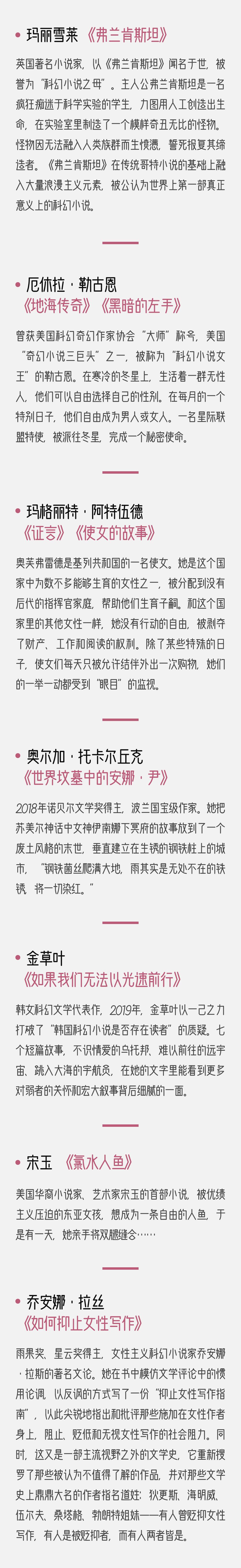 话题结尾,我们奉上顾适推荐的“女性科幻作家阅读书单”,也欢迎在评论区分享你的阅读经历和推荐书目~关注“后浪研究所”公众号,在后台回复“科幻”2个字,可以参加“科幻书籍盲盒”抽奖,获取推荐书单中的图书1本,快来参与吧~