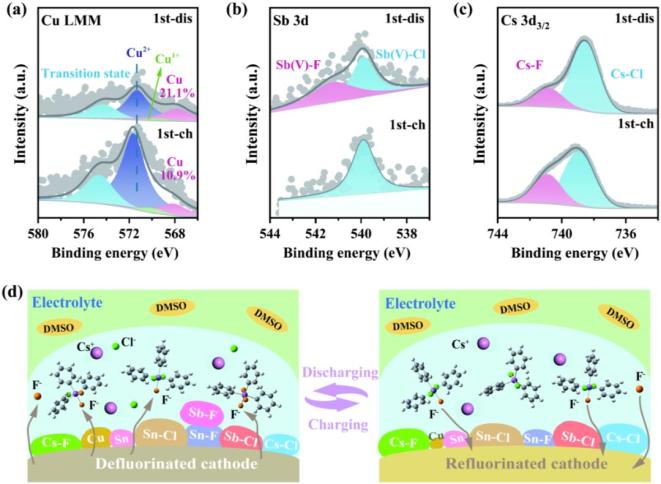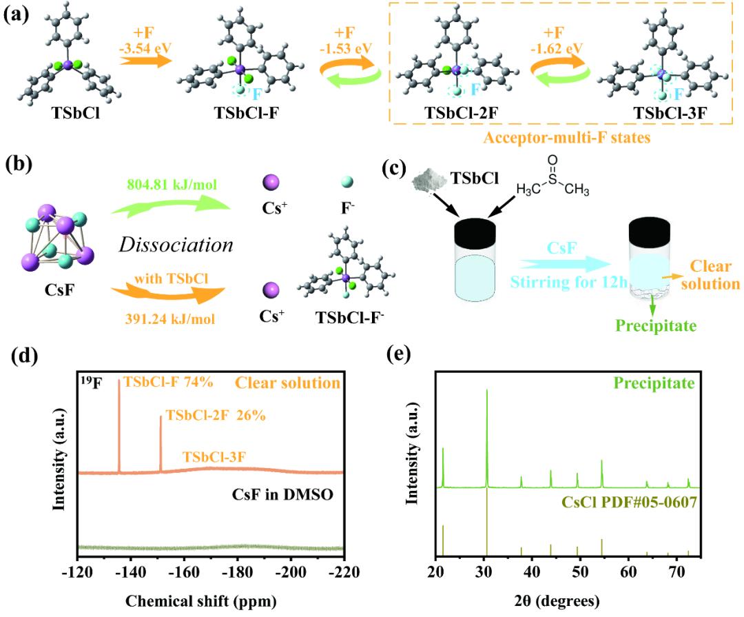 DFT计算显示,TSbCl对氟离子的吸附能为-3.54 eV,显著低于氟离子取代TSbCl分子上的氯所需的反应能(-1.80 eV)。这一比较说明,TSbCl优先形成六配位的锑化合物(TSbCl-F)。如果在电解质配方中TSbCl与氟离子的化学计量比小于1:1,则过量的氟离子可以进一步与六配位锑化合物中的氯交换,导致“受体-多氟态”的形成。这些“受体-多氟态”之间转变的能量(例如,TSbCl-F与TSbCl-2F之间为-1.53 eV,TSbCl-2F与TSbCl-3F之间为-1.62 eV)远低于TSbCl-F分子分解为TSbCl和氟离子的解离能,从而促进了电极处的阴离子受体-氟离子复合物的氟离子解离。在19F NMR光谱中,观察到了分别归属于TSbCl-F、TSbCl-2F和TSbCl-3F的三个峰。XRD确认电解质中的沉淀物为高结晶度的CsCl。这些结果表明CsF完全解离,存在“受体-多氟态”,且在CsF-TSbCl-DMSO电解质中不存在自由的氯离子。制备电解质所涉及的反应如下: