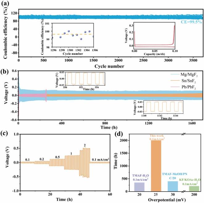 组装的半电池在0.1 mA/cm2的电流密度下,表现出超过3700小时的稳定循环,库仑效率约为99.5%,在整个循环过程中电压曲线波动极小。氟化与脱氟之间的极化保持在30 mV以内,无明显过电位。即使与成熟的锂金属电池系统相比,这种循环性能也尤为突出。分别以Mg+MgF2、Sn+SnF2和Pb+PbF2为对称电池的电极,在0.1 mA/cm2和0.1 mAh/cm2的条件下,Mg+MgF2//Mg+MgF2电池的循环寿命超过1700小时。然而,MgF2的高晶格能导致氟化/脱氟过程中的极化高达150 mV。Pb+PbF2//Pb+PbF2对称电池的极化较小,仅为30 mV。但在230小时后,界面退化和铅溶解导致极化显著增加。相比之下,Sn+SnF2//Sn+SnF2对称电池不仅实现了超过1700小时的稳定循环,且极化低至25 mV。Sn+SnF2电极的对称电池随着电流密度的增加,当电流密度高达2 mA/cm2时,过电位从25 mV升至420 mV,且每个阶段的过电位均高度稳定,波动极小。当电流密度回到0.1 mA/cm2时,过电位可恢复至25 mV。与现有关于氟离子电池(FIBs)的报道相比,“受体-多氟态”电解质实现了电流密度提升20倍、过电位显著降低以及循环寿命延长4-5倍。