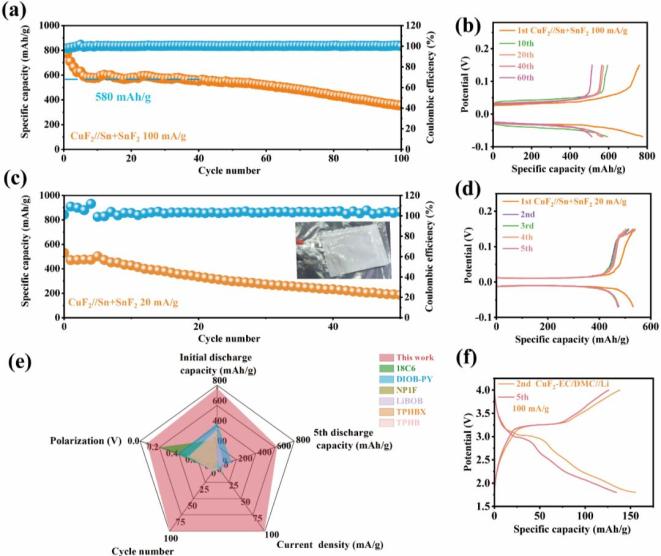 组装的全电池在100 mA/g的电流密度下,初始放电比容量高达772 mAh/g,放电平台在-0.03 V vs. Sn2+/Sn(即2.87 V vs. Li+/Li)。在最初的40个循环中,比容量保持在580 mAh/g,经过100次循环后,该电池的比容量保持在387 mAh/g,且在整个循环过程中库仑效率始终保持在100%。CuF2//Sn+SnF2全电池的极化较小,仅为0.06 V。组装的氟离子软包电池在20 mA/g的电流密度下,其初始放电比容量为530 mAh/g,放电平台在-0.01 V vs. Sn2+/Sn(即2.89 V vs. Li+/Li)。经过50次循环后,该软包电池仍保持200 mAh/g的可逆容量,且在这些循环中库仑效率约为98%。与目前报道的使用液体电解质的FIBs相比,我们利用“受体-多氟态”电解质的全电池表现出最低的极化、超长的寿命、最高的比容量以及在高电流密度下优异的容量保持率。组装的CuF2//Li电池在首次循环中表现出580 mAh/g的放电比容量,并有两个放电平台,分别约为2.5 V和2.3 V。