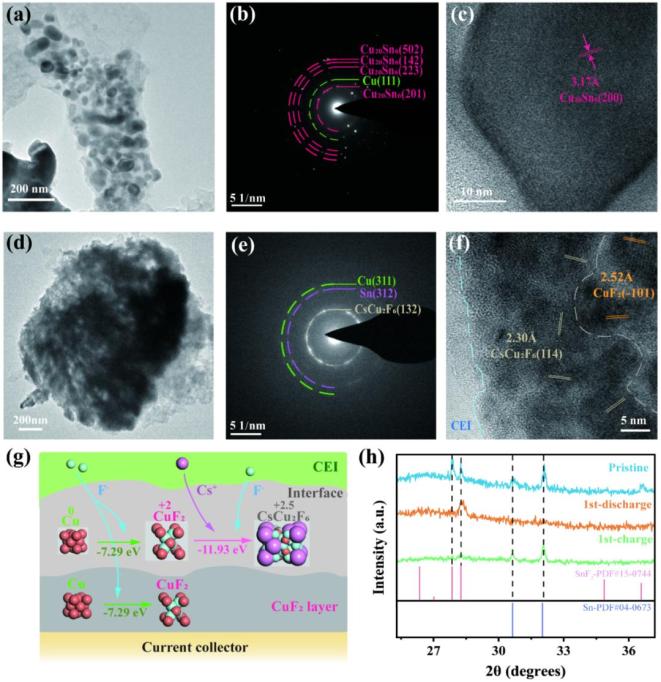 放电后,正极由大量纳米级颗粒组成。SAED显示,主要的放电产物是Cu20Sn6。少量Sn的存在是由于部分Sn从负极溶解到电解质中,而Cu与Sn的合金化有利于阻止Cu从正极溶解。HRTEM进一步显示出与Cu20Sn6的(200)晶面对应的清晰晶格条纹,证实了Cu20Sn6为主要放电产物。在充电后,Cu-Sn纳米颗粒的边界在再氟化过程中扩展,相应的界面合并形成更大的微米级颗粒。SAED显示,主要的充电产物是CsCu2F6。HRTEM进一步证实,充电产物由CsCu2F6和CuF2组成。CsCu2F6区域位于靠近正极-电解质界面(CEI)层的外侧,而CuF2主要存在于远离CEI的内层。这一结果表明,外部的Cu在氟化过程中倾向于与CEI内的Cs+结合,其中较大尺寸的Cs+可以稳定晶格中的高价Cu2.5+。我们采用DFT计算来进一步验证CsCu2F6生成的可行性并了解Cu的氟化路径。由CuF2与Cs+反应形成CsCu2F6的反应能为-11.93 eV。尽管CuF2的进一步氟化在热力学上是有利的,但由于Cs+的扩散动力学阻碍,该反应倾向于在CEI附近发生。Sn+SnF2电极的XRD结果显示,放电后,Sn的特征峰几乎消失,而SnF2的峰增强,表明Sn几乎完全氟化。在重新充电后,SnF2的峰显著减弱,而Sn的峰重新出现,表明SnF2脱氟为Sn。