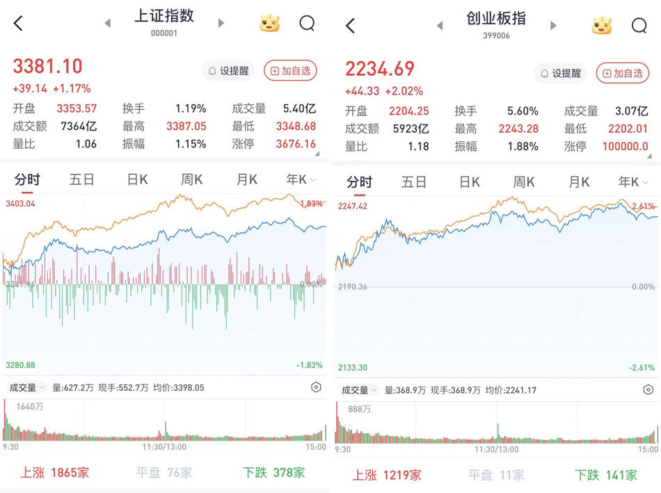 至收盘,上证综指涨1.17%,报3381.1点;科创50指数涨3.48%,报1121.58点;深证成指涨1.77%,报10898.75点;创业板指涨2.02%,报2234.69点。