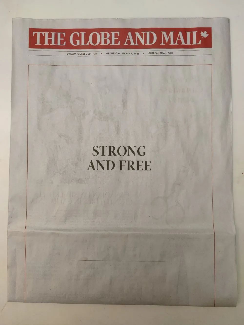 加拿大《环球邮报》5日出版的报纸罕见地在头版开天窗,仅刊登“强大和自由”粗体字,表达对美国发动关税战的抗议。