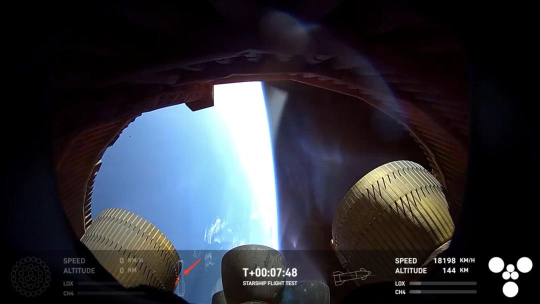 星舰第七飞直播画面中,箭头所指的位置,已经出现了燃料泄漏导致的火光 | SpaceX据报道,这些问题在一定程度上与V2版星舰的大幅度升级有关。为了更全面地掌握火箭的振动特性,航天工程师通常会进行 “全箭模态” 之类的大型试验,摸清火箭各个部位的振动频率和特性。V2版星舰相对于之前的版本,箭体结构、管路布局、规模尺寸都发生了巨大的变化。然而,SpaceX在快速迭代升级的过程中,可能没有充分测试和掌握V2版星舰全新的振动特性,导致了上次试飞失败。