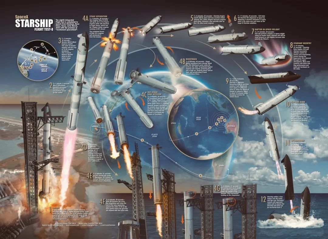由于第八次发射是对第七次发射的“复飞”,所以发射流程和目标基本一致,仍然是一次跨大气层亚轨道飞行——星舰不会进入环绕地球的轨道,而是进入太空绕飞半个地球后返回。