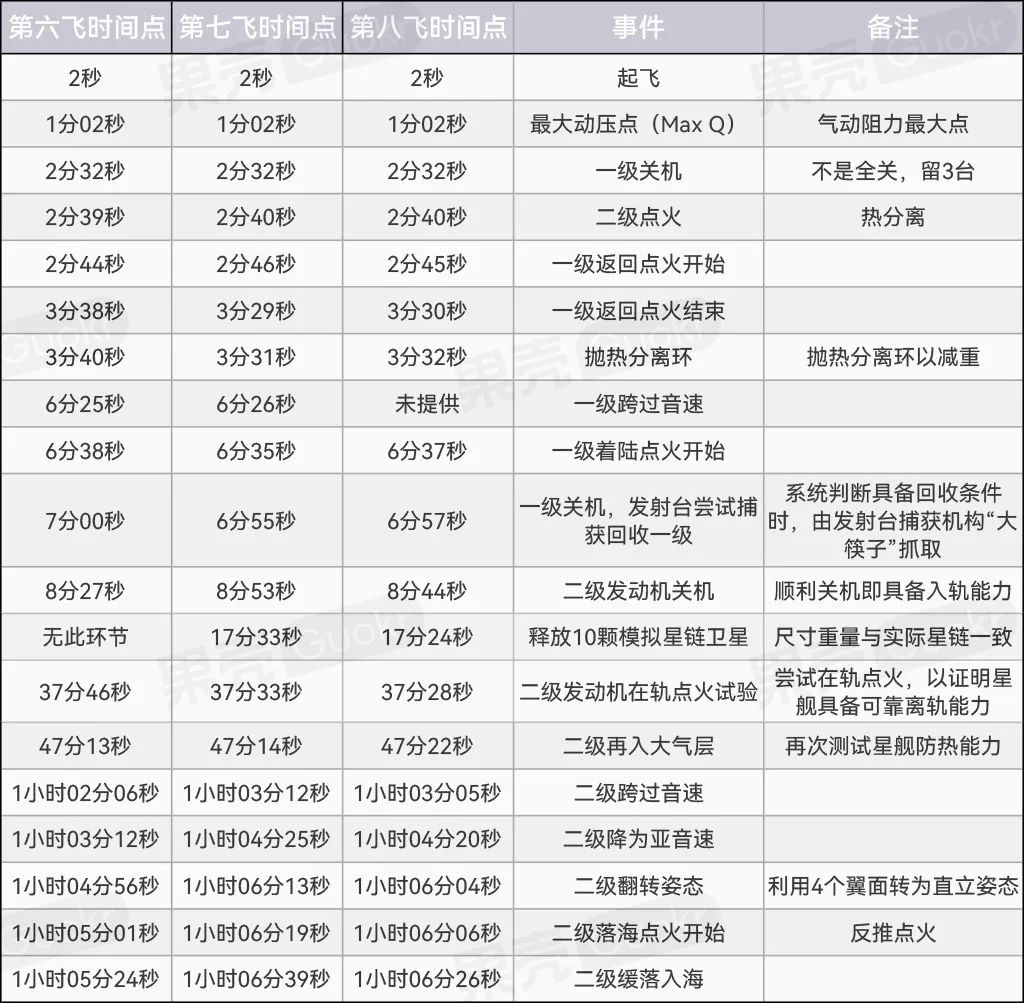 星舰第八飞全流程信息图 | Tony Bela对比星舰最近三次试飞的时间节点,可以清晰地看到,在火箭一级的上升和回收阶段,几次发射的时序安排几乎完全一致。这充分说明,V1版超重型助推器,其技术状态已经非常成熟和稳定。