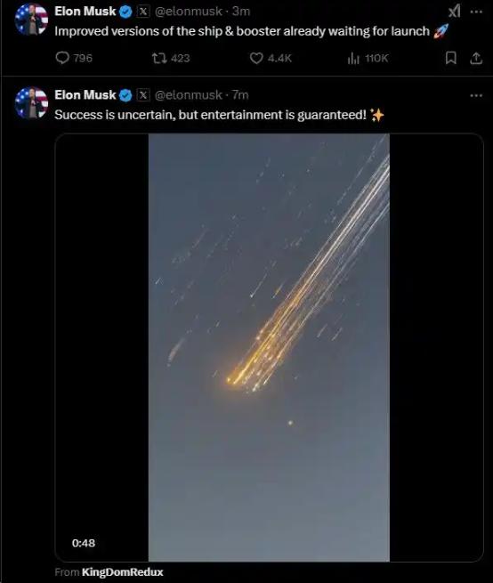 1月17日,马斯克发帖并配发视频称,成功是不确定的,他还写道,改进版星舰和助推器已准备就绪,等待发射。