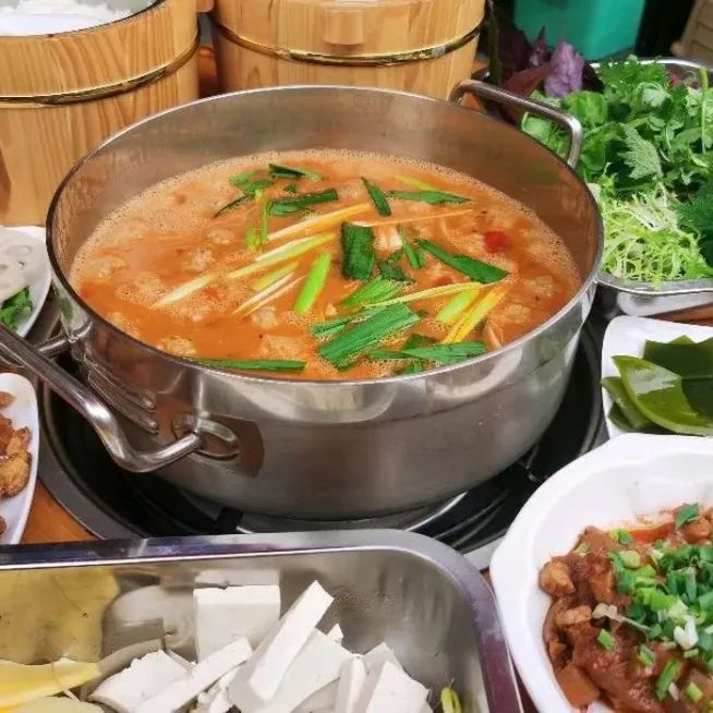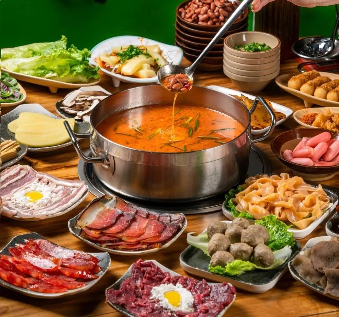 图源于@陈氏人家豆米火锅底汤中加入豆子慢慢熬,豆香浓郁,豆子绵密入味,浓稠的锅中煮出来,每片菜叶都挂汁,汤浇在米饭上,人均3碗饭打底!