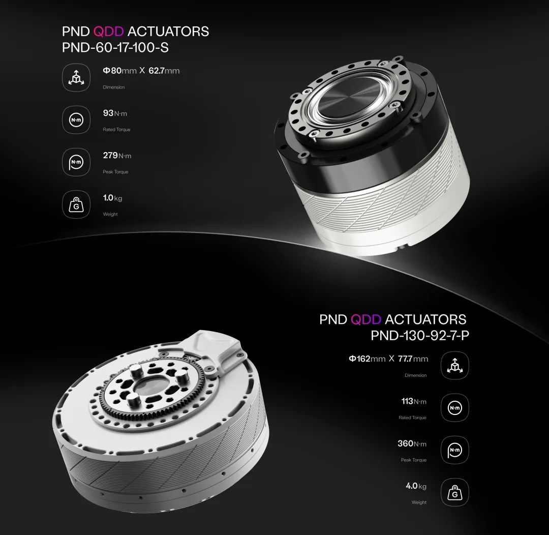 其中 PSA QDD 准直驱柔性力控执行器是 PNDbotics 公司的重要产品,它集成了电机、PND-Network 控制器和变速箱,拥有广泛的减速比参数,可适配不同场景下的机器人搭载。