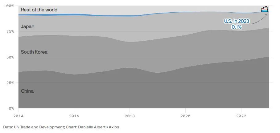 到2023年,中国建造的商船吨位已占到全球50%,美国则为0.1% 美国Axios新闻网报道截图新上台的美国特朗普政府正寻求提高造船能力,以对抗中国的造船业。当地时间3月4日,特朗普在美国国会联席会议上发表演讲,宣称要“重振美国造船业”,“让这个行业回归美国,这是它应有的归宿”。他计划在白宫设立造船办公室,并提供特殊的税收优惠。
