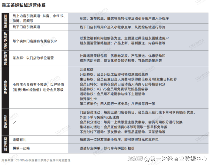 在更短期高转化的营销策略上,霸王茶姬通过私域体系运营在2024年5月份实现了注册会员数量突破1.3亿。具体来看,霸王茶姬小程序以优惠券发放为主,包含面向会员定时发放的会员权益优惠券,不定时发放的免配送券、打折券等优惠。在社群运营端,霸王茶姬通过店长IP以门店为单位进行运营,包括粉丝专属福利发放以及品牌文化相关内容科普,以此提升会员的信任度和粘性。另外,霸王茶姬还打通了私域体系的所有板块,包括小程序商城、微信公众号、企微号、社群等,以此增加私域用户触点。