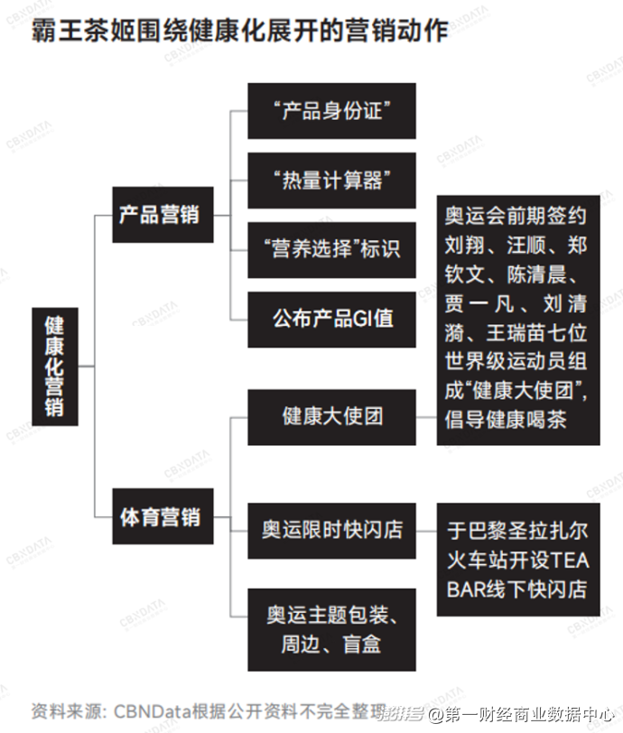 首先,霸王茶姬将“茶饮健康化”提升到战略层面,通过一系列动作向消费者侧传达产品健康心智。包括推出“产品身份证”、显示产品GI值、上线“热量计算器”、推行“营养选择”标识等,将品牌与健康标签深度绑定。也同样基于大健康策略,霸王茶姬选择了体育营销的方向,并在奥运期间大力投入。