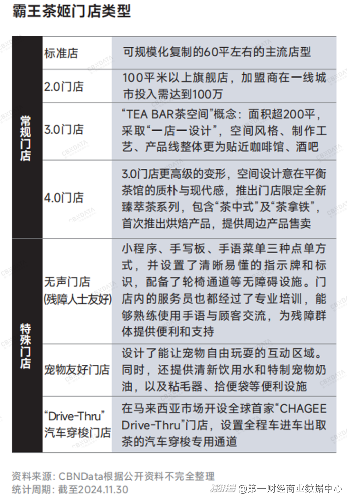 同时推出门店限定的臻萃茶系列,包含了“茶中式”与“茶拿铁”,且首次推出烘焙产品贝果系列,这一模式也更类似于星巴克臻选上海烘焙工坊。首批16家试点的4.0门店均落地上海,其中上海龙之梦店的店铺前身正是已营业十多年的星巴克门店。除常规门店,霸王茶姬也进一步创新门店模型,开出了宠物友好、无声门店等针对细分场景和人群的店型,在马来西亚则开设了全球首家设置汽车穿梭专用通道的车进车出门店。