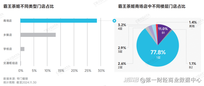 霸王茶姬率先在门店选址上循迹星巴克。窄门餐眼数据显示,霸王茶姬门店中商场店占比最高,达到26.18%,其中有接近八成的商场店分布在商场1层。久谦咨询数据显示,霸王茶姬门店位置与星巴克500米内相邻的门店数占比较高,以最直接的方式对标星巴克门店,以此提升品牌调性。