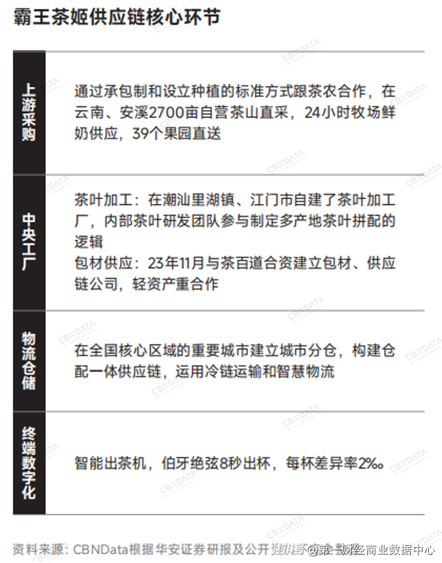 基于上述产品线基础,霸王茶姬在供应链布局上能够更为聚焦,因为一杯奶茶只需要有茶叶、奶和包材三种原料。霸王茶姬通过承包制和设立种植的标准方式跟茶农合作,上游拥有2700亩自营茶园。在中游的加工环节,霸王茶姬自建了茶叶加工厂;同时与茶百道合资建立包材、供应链公司,以轻资产重合作的模式运营。