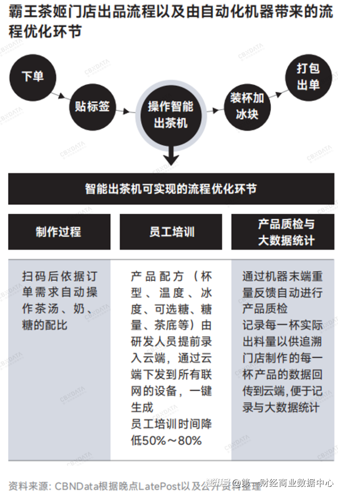 在下游,霸王茶姬通过引入自动化机器、减少人工参与度,实现了“8秒/杯,2‰差异率”的出品标准。在霸王茶姬门店的出品环节,店员只需要进行点单、操作智能出茶机以及装杯打包的操作。自动化机器帮助霸王茶姬实现了制作过程与员工培训流程的简化,也能够实时记录原料用量与产品出单数量,方便上下游链条的管理与优化。