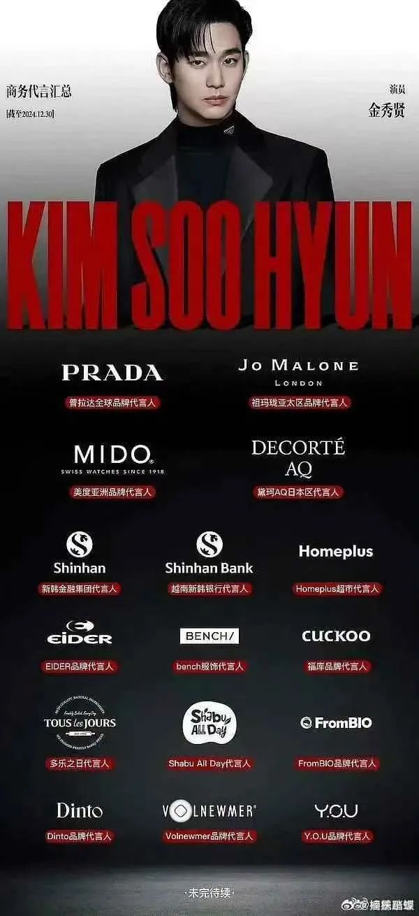 此外,根据市场行情,金秀贤的三星电子等本土品牌代言单年代言费通常在10亿-30亿韩元之间。有网友估算,金秀贤每年总代言收入可能在100亿-200亿韩元之间(约750万-1500万美元)。