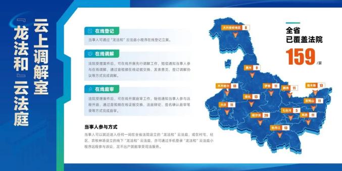 黑龙江法院坚持和发展新时代“枫桥经验”,深入贯彻落实《人民法院第六个五年改革纲要(2024—2028年)》精神,积极推进在线法庭、共享法庭建设,方便当事人异地参加诉讼。截至2025年2月,在全省159家法院建成159间“龙法和”云法庭(调解室),在矛盾纠纷多发的村屯、社区、农牧林场建成434间线下“龙法和”云法庭,当事人可以就近进入任何一间云法庭,异地参加全省任何一家法院组织的庭审或调解。当事人亦可通过手机登录“龙法和”云法庭小程序参加诉讼,足不出户就能享受司法服务。
