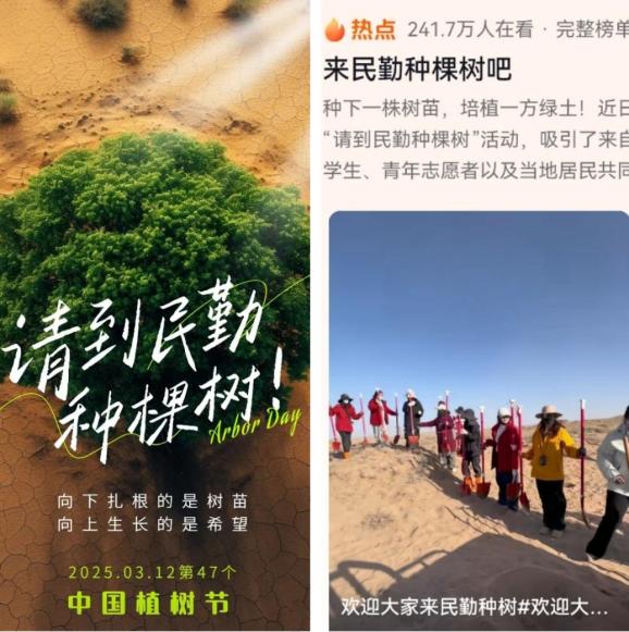 最近互联网上瓜实在太多。但小编还是在铺天盖地的明星八卦中,发现一个真正值得转发点赞的热点话题——来民勤种棵树吧。