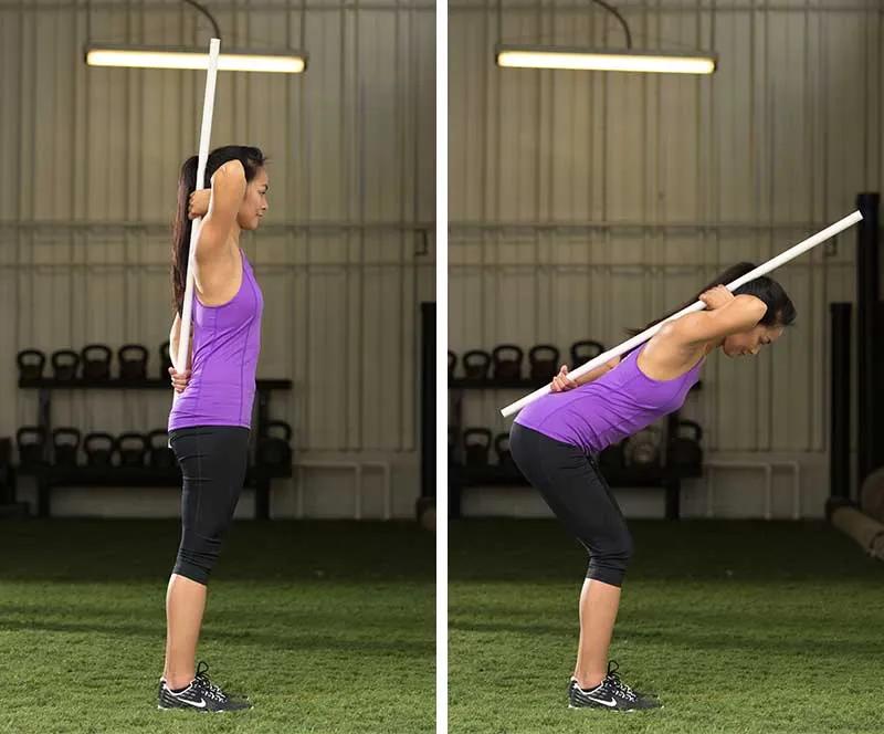 如果最开始练习还是难以找到感觉,不妨考虑在后背放一根棍子。全程保持背部和后脑勺贴住棍子,如果能完整地完成动作轨迹就说明做对了哦!