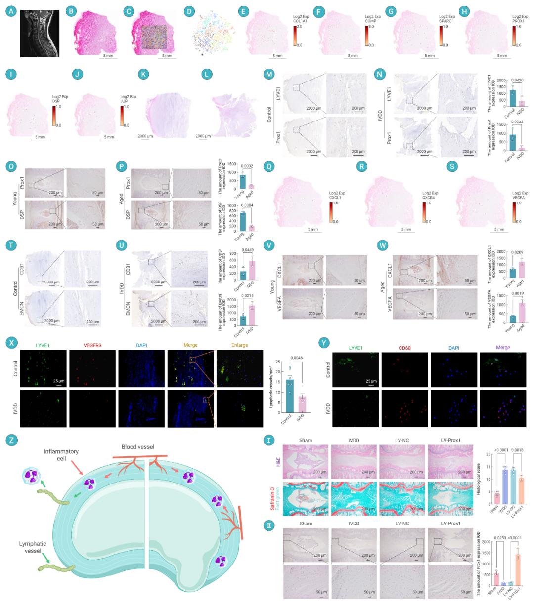 椎间盘内发现淋巴管,可减轻椎间盘炎症,并延缓退变进程该研究通过空间转录组学等技术,发现了椎间盘纤维环中存在淋巴管的新证据。这一发现直接挑战了“椎间盘内无脉管系统”的传统观点,并揭示脉管系统在椎间盘炎症和退变中的关键作用,为理解血管和淋巴管如何影响椎间盘健康提供了新的视角。