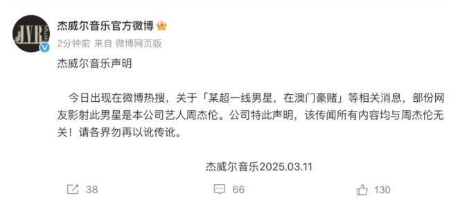 3月11日,杰威尔音乐官方微博发布声明:出现在微博热搜,关于“某超一线男星,在澳门豪赌”等相关消息,部份网友影射此男星是本公司艺人周杰伦。公司特此声明,该传闻所有内容均与周杰伦无关!请各界勿再以讹传讹。