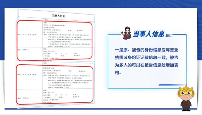 首先,填写当事人信息时需要注意两点:一是原、被告的身份信息应与营业执照或身份证记载信息一致,被告为多人的可以在被告信息处增加表格。二是在准确填写送达地址和联系方式的同时,建议选择一种常用的电子送达方式。