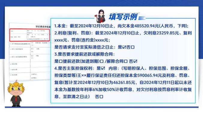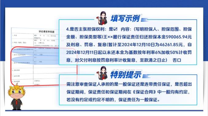 二是主张担保权利的,一般为要求保证人承担保证责任或者对抵押物享有优先受偿权,需注意审查保证人承担的是一般保证还是连带责任保证,是否超出保证期间,保证责任和保证期间在《保证合同》中一般均有约定,若没有约定或约定不明的,保证责任为一般保证。三是主张实现债权费用的,需列明明细及数额。第三,在填写约定管辖和诉讼保全时,需要注意:对于管辖,合同中有约定的,填写合同条款及内容。需注意,有仲裁条款或仲裁协议约定的,请向相应的仲裁机构申请仲裁。对于保全,已经诉前保全的,明确填写保全法院和保全时间,没有申请诉前保全的,明确是否申请诉讼保全。保全有助于防止债务人转移财产,促进纠纷实质化解。