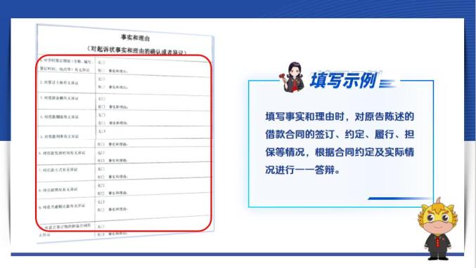 第二,填写事实和理由时,对原告陈述的借款合同的签订、约定、履行、担保等情况,根据合同约定及实际情况进行一一答辩,认为属实,勾选“无”异议,认为不属实,选择“有”异议,并写明事实和理由。