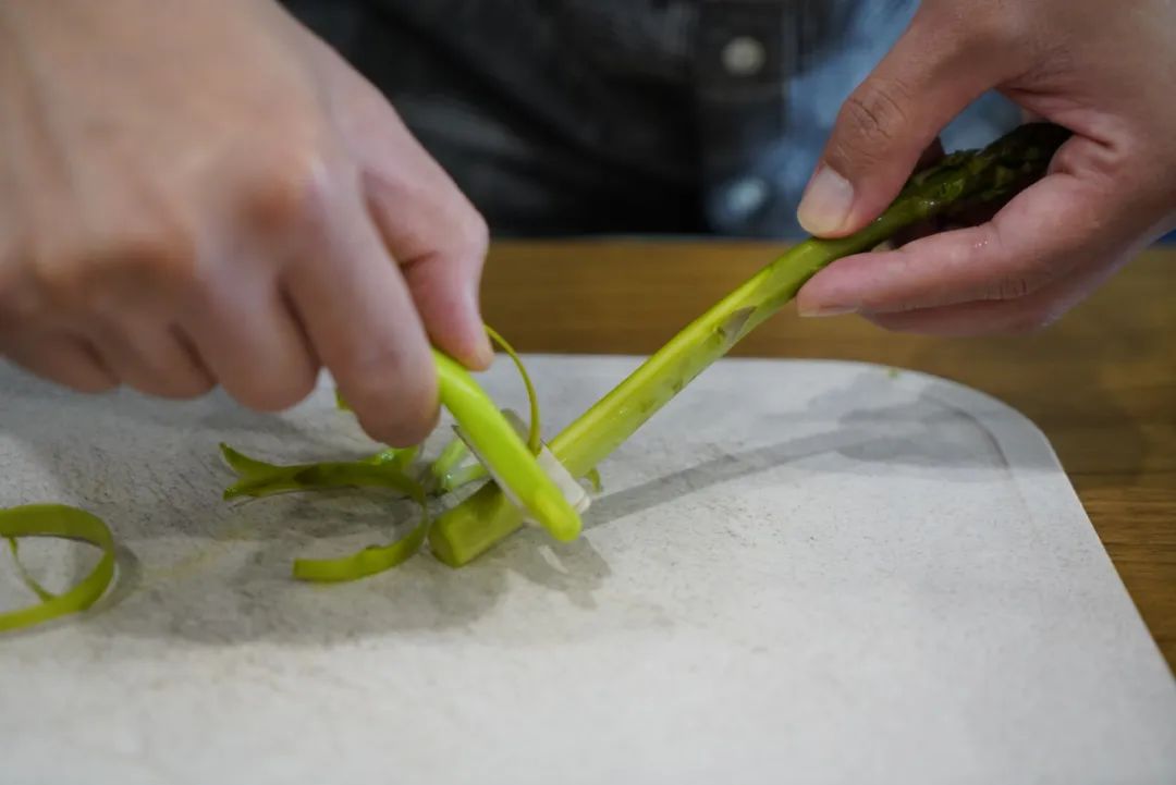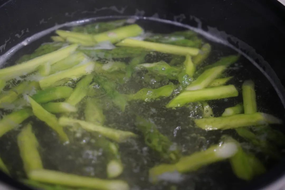 芦笋削皮后斜切,焯水后捞出,翠绿中锁着清甜的汁水,恰似咬住一口江南烟雨。