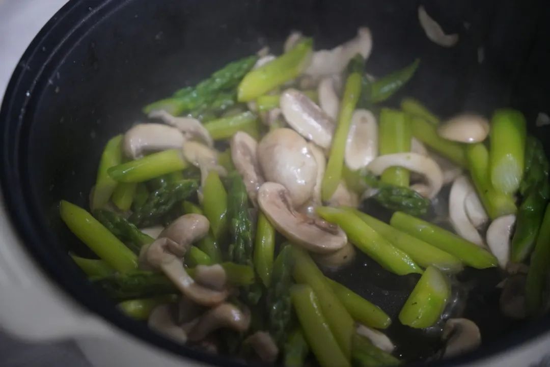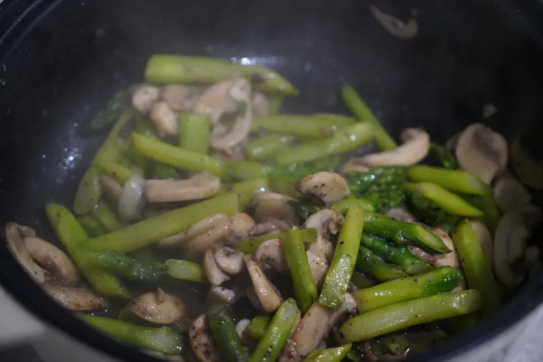 蘑菇和芦笋一起翻炒,用盐简单调味,再加入灵魂黑松露酱,在热力催动下散发着独特的香气。