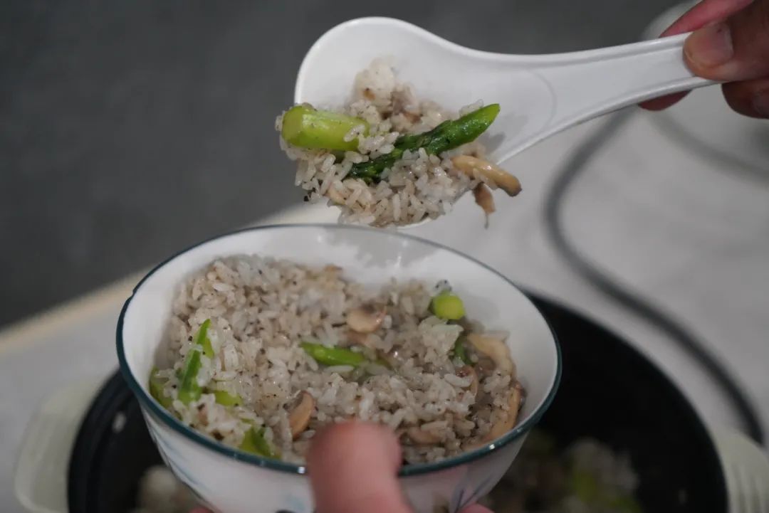 吸收了汤汁的米粒变得油润饱满,在芦笋和蘑菇的加持下,每一口都带有春天的清新气息。