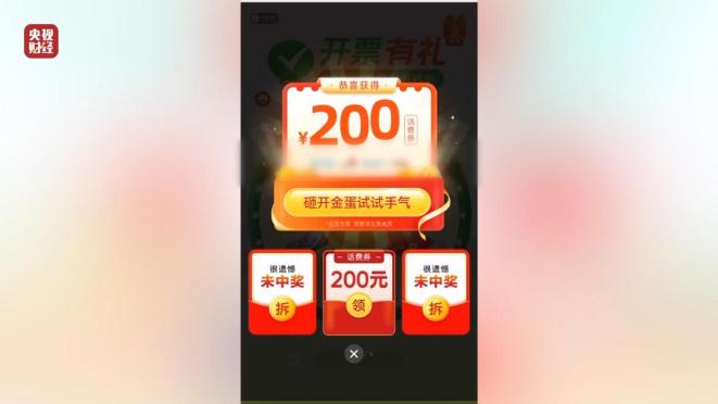 最近,有关手机抽奖引发消费陷阱的投诉接连不断。记者发现,在电子发票第三方服务平台“诺诺网”开发票,提交发票信息之后,页面会自动跳转至“大转盘”小游戏。点击抽奖,系统随即提示“抽中大奖”,奖品是“200元话费券”。然而记者购买后,并没有任何话费到账,也没有看到200元的话费券。