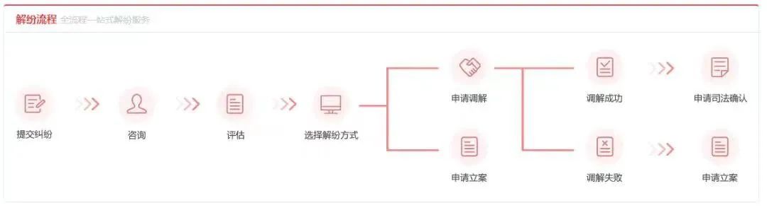 填写调解案件信息→选择调解员→调解员受理→在线调解→调解(成功)→在线确认调解协议→申请司法确认/申请出具调解书调解(失败)→在线立案