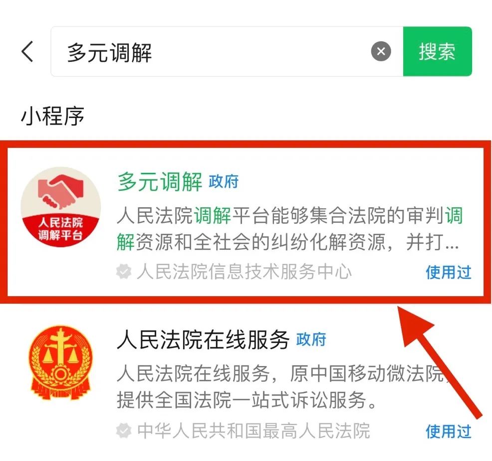 1.搜索。打开手机微信小程序,搜索“多元调解”。