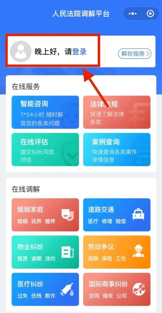 2.登录。进入小程序主界面,点击“登录”进入人民法院调解平台。