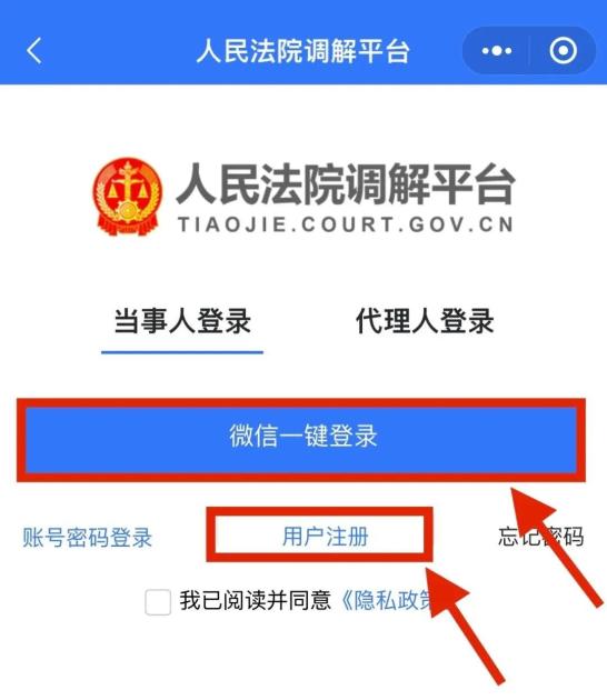 3.注册。选择“当事人登录”点击“微信一键登录”或者“用户注册”。