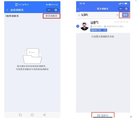 5.选择调解员。系统根据提交的案件信息智能推荐调解员;申请人也可点击右上角“更多调解员”选项,在列表中选择调解员,或者输入名字搜索特定调解员,点击“选择TA” ,提交后等待调解员处理。