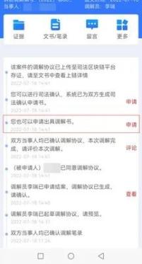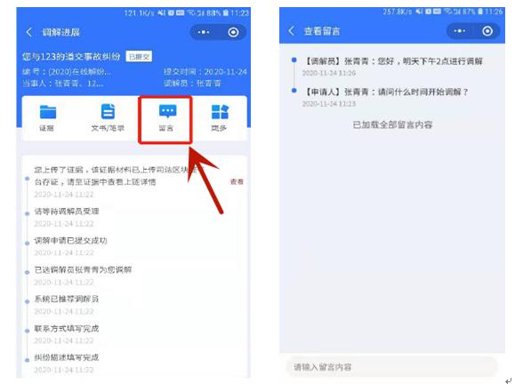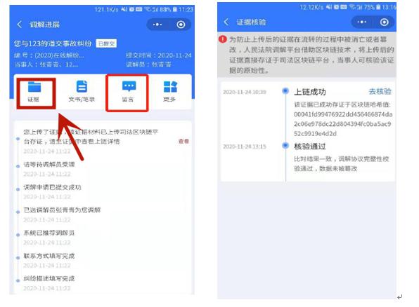 6、查看案件动态。案件信息提交后,可在案件信息页查看案件处理进展。点击“证据”可对上传的证据进行核验比对。点击“留言”,可向调解员发送留言,进行咨询。